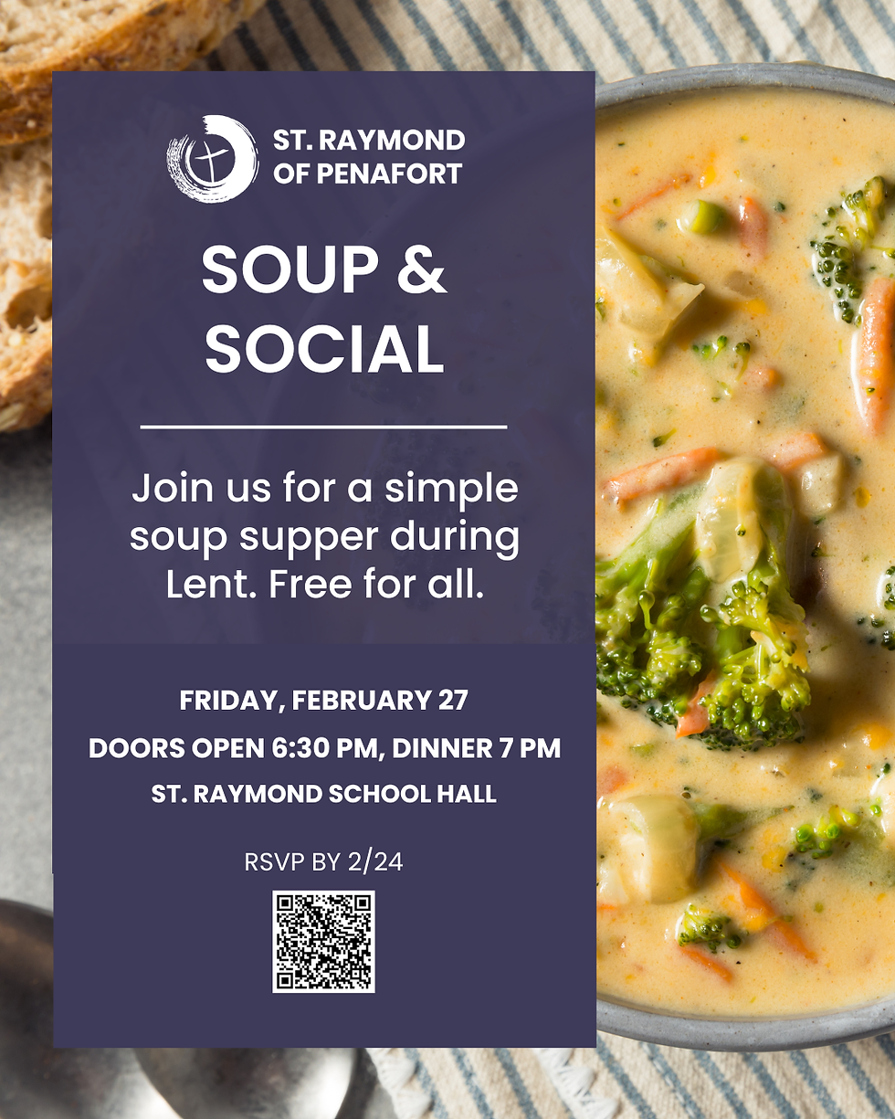 Our Soup & Social is free for all, but we ask that you RSVP to ensure we have enough food. Please complete this form if you plan to attend. Daniele will also be taking RSVPs in person after the 10 AM mass on 2/14 and 2/21.